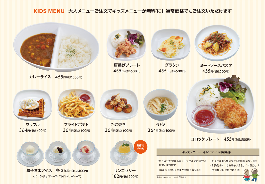 お子様に定番人気のカレーライスやコロッケプレート、食後のデザートなど、対象のキッズメニューからお好きなものをお選びいただけます。※利用条件があります